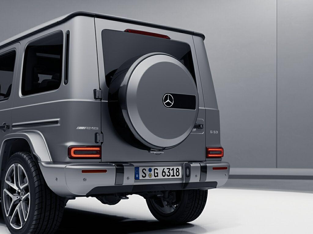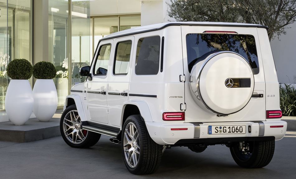 Unverwechselbare Design-Merkmale verleihen dem neuen AMG G 63 sein einzigartiges Aussehen: die kantige Silhouette, die aufliegende Motorhaube, die außenliegenden Türscharniere, die runden Hauptscheinwerfer, die aufgesetzten Blinker, die robusten Türgriffe, die kräftigen Schutzleisten mit Einlagen in hochglanzschwarz und silbernem AMG Emblem sowie das exponierte Ersatzrad an der Hecktür mit Abdeckung aus Edelstahl und dreidimensionalem Mercedes Stern.