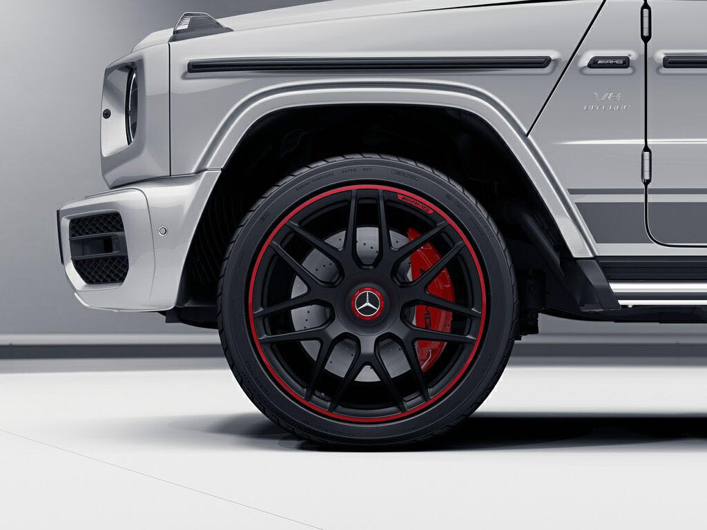 Charakteristisch für den G 63 sind auch die Radlaufverbreiterungen vorn und hinten, die Platz für größere und breitere Räder schaffen. Serienmäßige Trittbretter, eigenständige Zierteile an Front- und Heckstoßfänger sowie die serienmäßige Metalliclackierung ergänzen das exklusive Exterieur. Weitere Erkennungszeichen sind die „V8 BITURBO“ Schriftzüge an den vorderen Kotflügeln und das Mercedes-AMG G 63 Typschild an der Hecktür. Rote Bremssättel, gelochte Bremsscheiben und erstmals erhältliche 22-Zoll-Felgen runden das Exterieurdesign ab.
