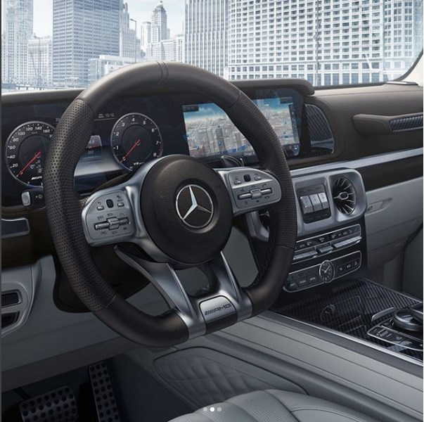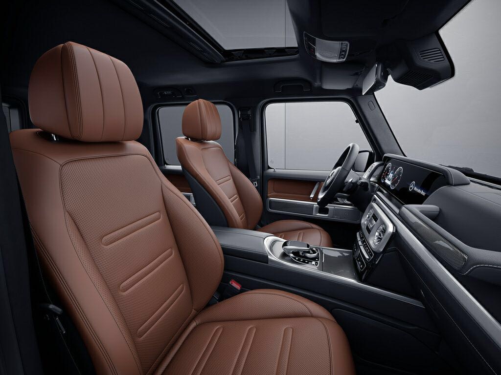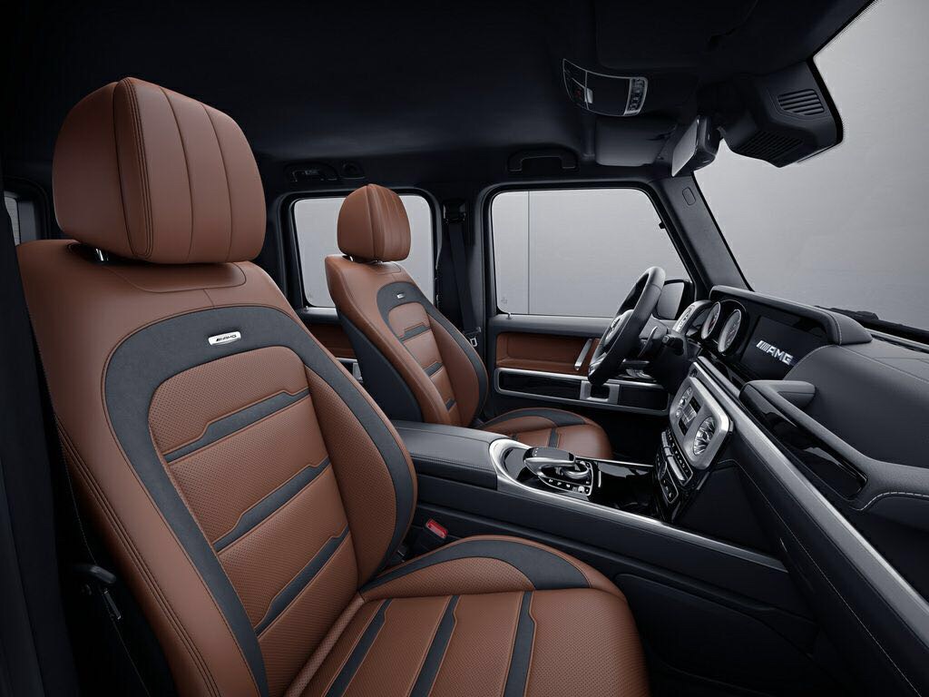 Der neue G 63 erhielt ein grundlegend neu gestaltetes, modernes Interieur, das gezielt Elemente des Exterieurs aufgreift. So spiegeln sich die Form der Rundscheinwerfer in den seitlichen Belüftungsdüsen und die Gestaltung der Blinker in den Hochtönern auf der Instrumententafel wider. Typisch für den G 63 sind auch der Haltegriff vor dem Beifahrer oder die in Chrom hervorgehobenen, zentral platzierten Schalter für die drei Differenzialsperren. Die völlig neu designte Instrumententafel enthält serienmäßig analoge Tuben als Rundinstrumente. Optional kommt das volldigitale Widescreen-Cockpit mit virtuellen Instrumenten im direkten Blickfeld des Fahrers sowie dem Zentraldisplay über der Mittelkonsole zum Einsatz. Optisch verschmelzen die beiden 12,3-Zoll-Displays unter einem gemeinsamen Deckglas zu einer Einheit. Der Fahrer kann drei verschiedene Ansichten wählen – „ Klassisch“, „Sportlich“ und „Progressiv“ – und die gewünschten Informationen individuell aufrufen.