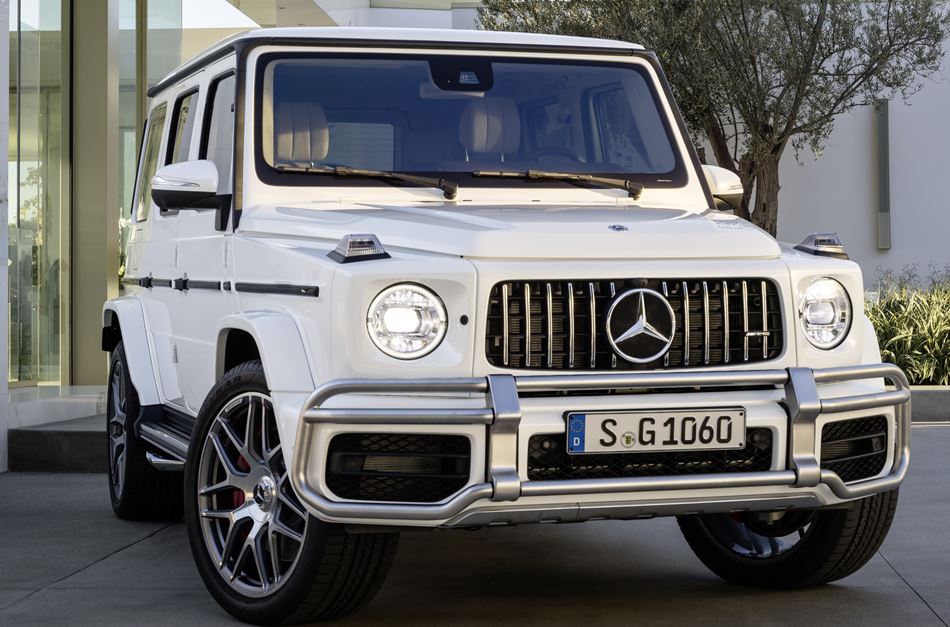 Mit dem neuen Mercedes-AMG G 63 (Kraftstoffverbrauch kombiniert: 13,2 l/100 km; CO2-Emissionen kombiniert: 299 g/km) erlebt die G-Klasse von Mercedes-AMG die größte Veränderung ihrer Geschichte – und bleibt ihren bewährten Tugenden treu. Seine Alleinstellung unter den Performance-Geländewagen untermauert der G 63 durch den leistungsstarken Antrieb, das neu entwickelte AMG RIDE CONTROL Fahrwerk, die AMG-spezifischen Fahrprogramme und das neue Interieur mit optionalem Widescreen-Cockpit. Die Basis für die AMG-typische Driving Performance auf und abseits befestigter Straßen bilden der 585 PS starke 4,0-Liter-V8-Biturbomotor, der heckbetonte Allradantrieb (40:60) mit drei Differenzialsperren, das extrem schnell schaltende 9-Gang-Automatikgetriebe, die Doppelquerlenker-Einzelradaufhängung vorn sowie die adaptive Verstelldämpfung. Die Neuinterpretation des unverwechselbaren Designs setzt mit der AMG-spezifischen Kühlerverkleidung, den Radlaufverbreiterungen, den markanten Sidepipes der Abgasanlage und den bis zu 22 Zoll großen Rädern charakterstarke Akzente.